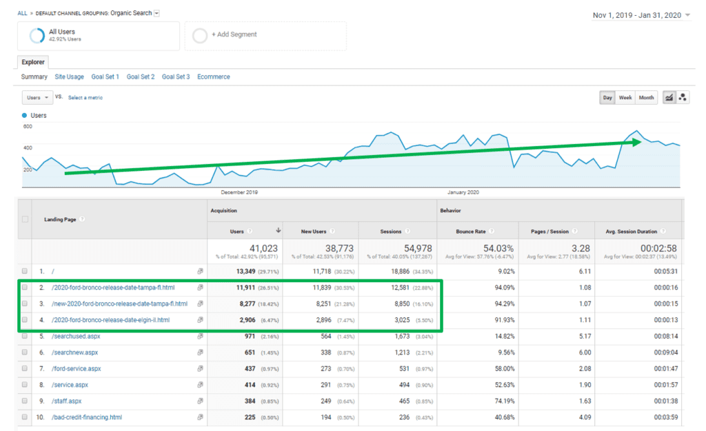 Over a 3-month span, over 10,000 new users found the Bill Currie Ford website through this 2020 Ford Bronco page. Because the site ranked nationally, the majority of these users are not shoppers who will buy a vehicle from this dealership. However, this content page still increases visibility for local shoppers as well. That increase in views translates into an increase in leads, which could turn into an increase in foot traffic in the showroom – especially when the 2020 Ford Bronco rolls in.